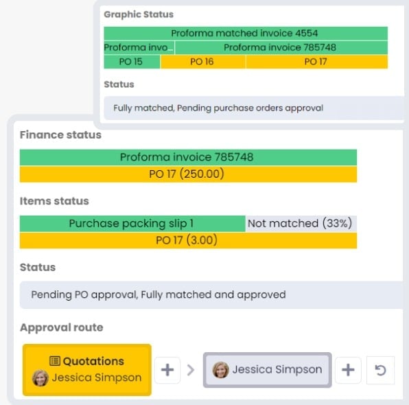 Procee מאפשרת לזהות ולשייך את החשבונית לבקשת הרכש המתאימה בתוך שניות, ללא מאמץ: העלאת קובץ חשבונית עם OCR מובנה שמקליד את המידע עבורך באופן אוטומטי מסלול אישור ייעודי לחשבוניות אישור חשבונית לתשלום רק לאחר התאמה ואישור של מלוא סכום הבקשה יצירת בקשות תשלום על בסיס חשבוניות מאושרות ושליחתן למסלול אישור נוסף זיהוי אוטומטי של חשבוניות שהוזנו מחדש או קבצי חשבוניות כפולים זיהוי אוטומטי של אי התאמה בין ספק לקובץ שהועלה הצעה אוטומטית של בקשות רכש שמתאימות לחשבונית חישוב אוטומטי של תאריך תשלום בהתבסס על תנאי התשלום התאמת חשבוניות עסקה-מס