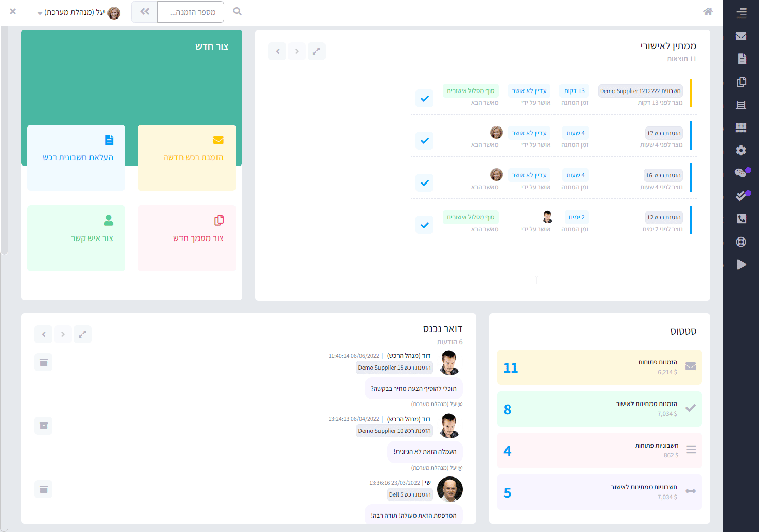 כל יישות במערכת (הזמנות רכש, חשבוניות מס לקוח, חשבוניות מס/עסקה ספק וכו…) נכנסת למסלול אישורים כך ששום מסמך לא מופק ללא האישורים הרלוונטיים