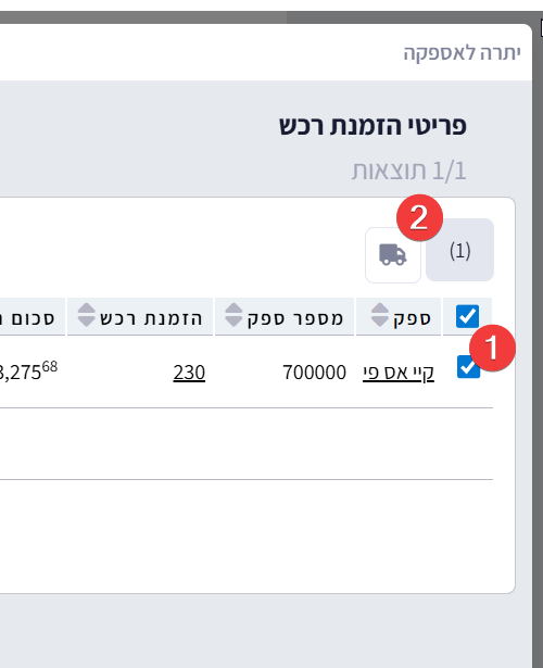 במסך יפתחו לפנינו כל הפריטים שעדיין לא סופקו, נבחר פה בV את הפריטים שהתקבלו (לא ניתן לסמן פריטים עבור יותר מספק בודד)