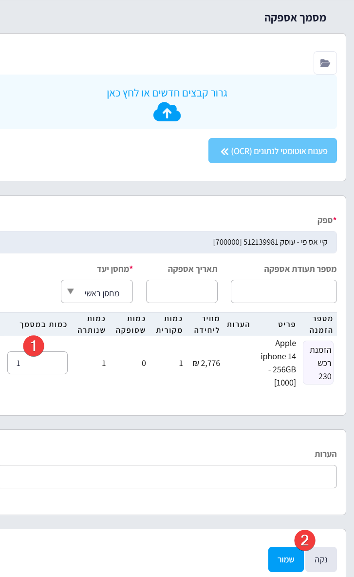 במסמך האספקה נוכל לציין את הכמות שנתקבלה